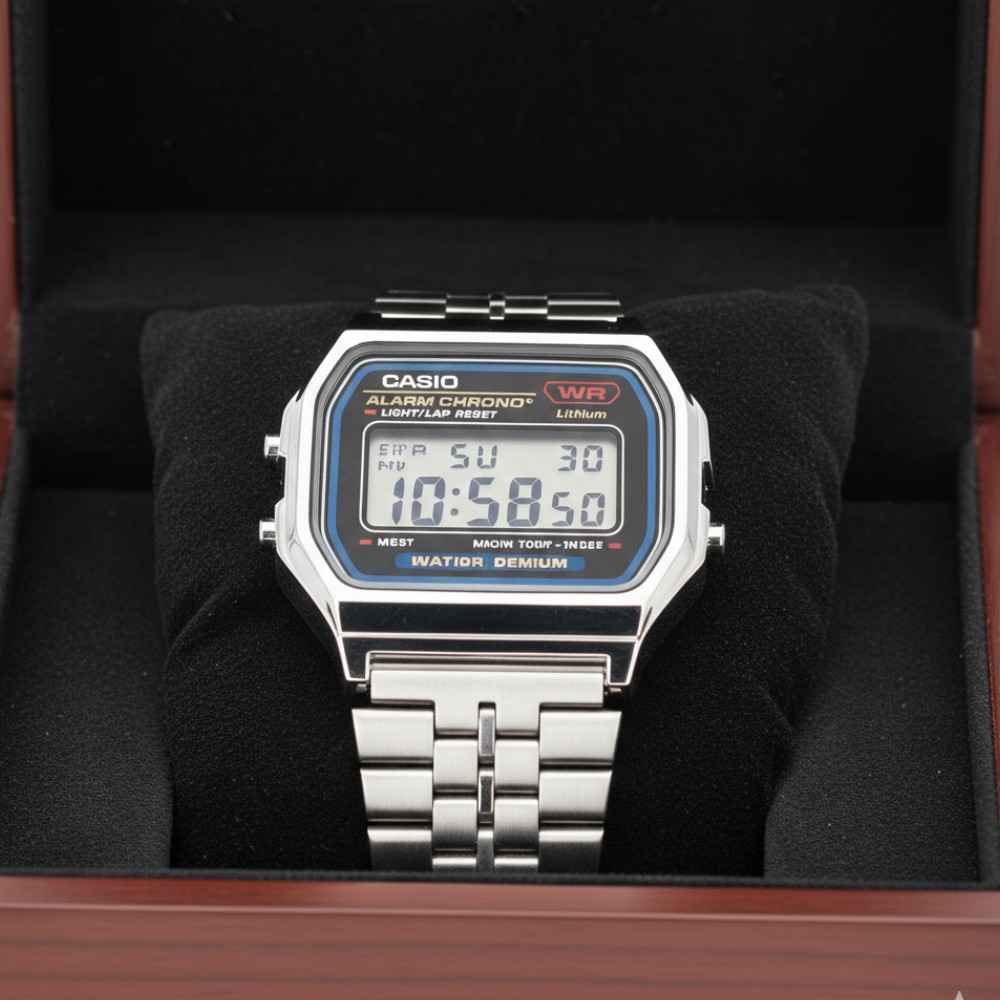 This unisex vintage digital silver watch is classified as a premium dress watch, yet its rugged build makes it suitable for casual adventures. The compact dimensions (approx. 20.5 x 0.8 x 3.3 cm) ensure a sleek profile on the wrist. Consequently, it doesn’t feel bulky under a shirt sleeve or jacket. The combination of a classic black face and polished silver metal makes it an easy match for other jewelry.